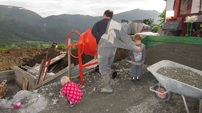Dugnad! Støyping av plate. Endeleg ein fin dag og naboane er kjekke og hjelpe oss!